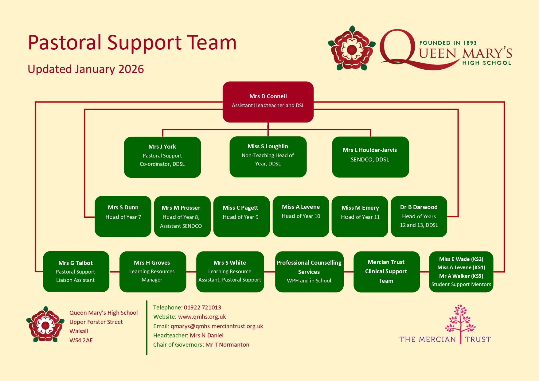 To get in touch with any of these members of staff please phone the school line 01922 721013 or email qmarys@qmhs.merciantrust.org.uk titled for the attention of: